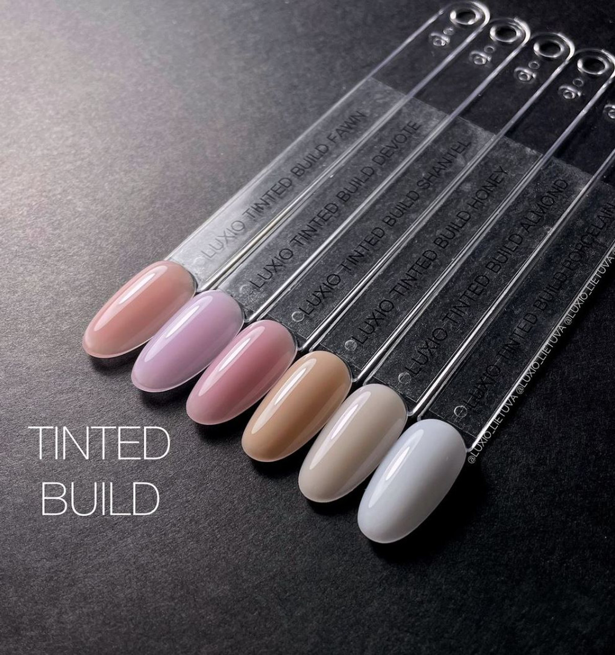Select your desired Luxio® Build Shade. Paint a thin layer across the entire nail plate – do not cure. Next, apply a bead of Luxio® Build to the centre of the nail to create a strong apex and allow the product to self-level for a smooth and even surface. Using either the Luxio® brush (a liner brush) to gentle make any adjustments before curing for 30 seconds in an Akzentz LED light.